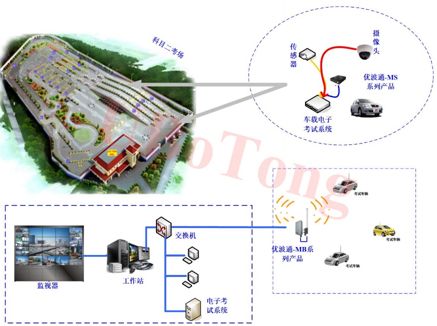 由于场考面积较大,所以采用6 台中心基站来进行信号的覆盖,20 台车载在场地内同时进行考试,经过测试和实际应用,优波通无线设备可以无缝漫游传输,后台监控中心没有出现中断和卡的现象,解决了之前的视频和数据回传卡段现象。