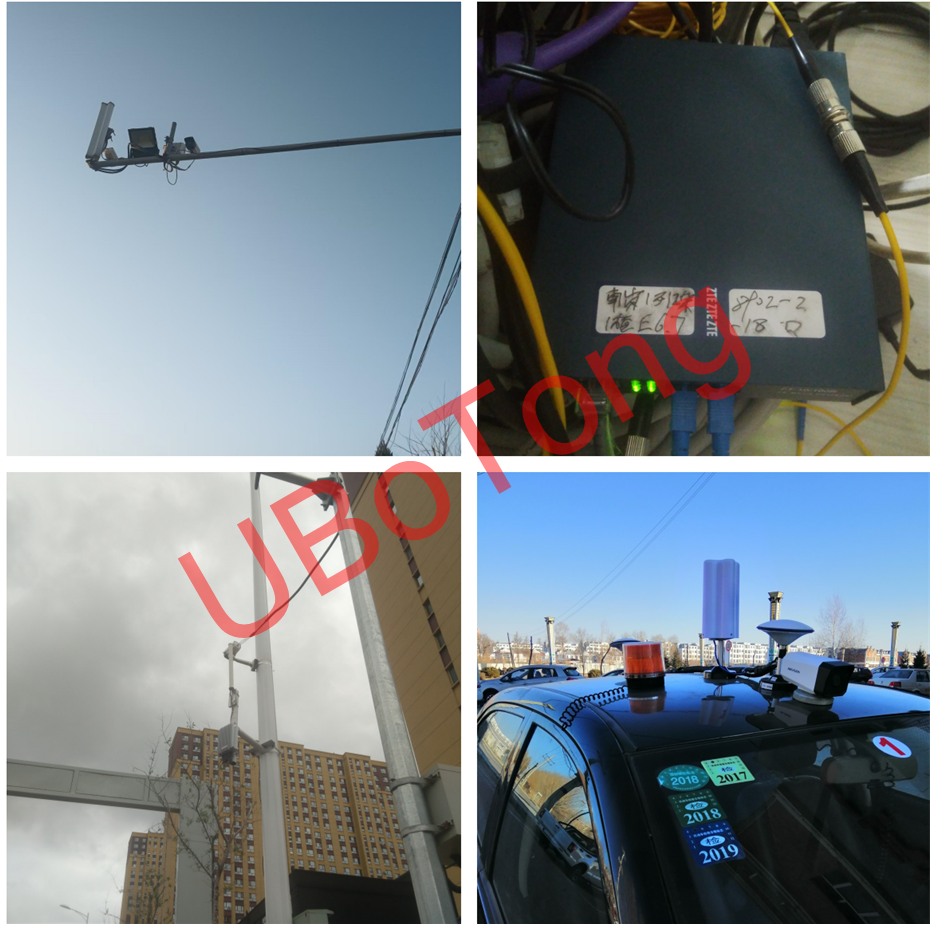 针对本方案中涉及到的考试线路,中间有掉头和转弯存在,这对基站架设位置提出了要求。但为节约警力、加强考试过程中的监管力度和实时数据的采集,决定采用了自动化的考试系统。其中出发地址为驾校监控中心位置,考试车辆9辆,根据考试线路、考试车数量等因素,设计在驾校及考试范围内架设了5.8G 电信级大功率无线基站,基站之间分布着合适的距离,以保证考试车辆在高速行驶中达到良好的无缝漫游传输效果。UBotong室外智能基站覆盖范围大,带宽和接入容量高,快速漫游切换机制,同频组网技术,无缝漫游视频优化处理等,保证考试车辆上的监控视频、语音和各种传感器的数据稳定传输,从而让电子考试系统准确、可靠的运行。再通过光纤将基站接收到的数据传回监控中心,通过硬盘录像机、解码器、分频器等设备输出在电视墙上,并实时把车载机的位置、考试路段、成绩情况等数据显示在电视墙上。