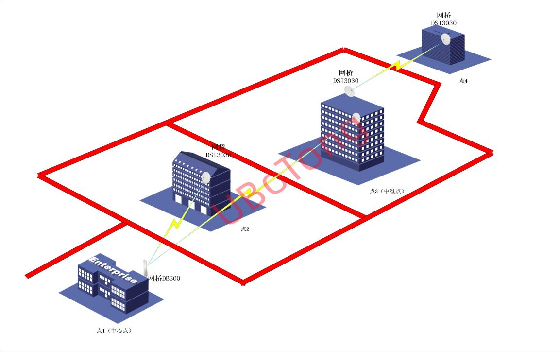 根据现场情况分析需要安装设备的点共有 4 个,我们将采用混合型的桥接方式,即点对点和点对多点。这样我们用 5 套设备进行桥接。其中中心点用 1 对 2 的外接天线设备和一个 90°外接板状天线,其余 3 点用内接天线的网桥设备。其中点 3 做为中继点需要放置 2 套无线设备。由上可知,点 1 和点 2、点 3 进行 1 对 2 的直接数据传输;点 1 和点 4 之间则通过中继点点 3 进行数据传输。