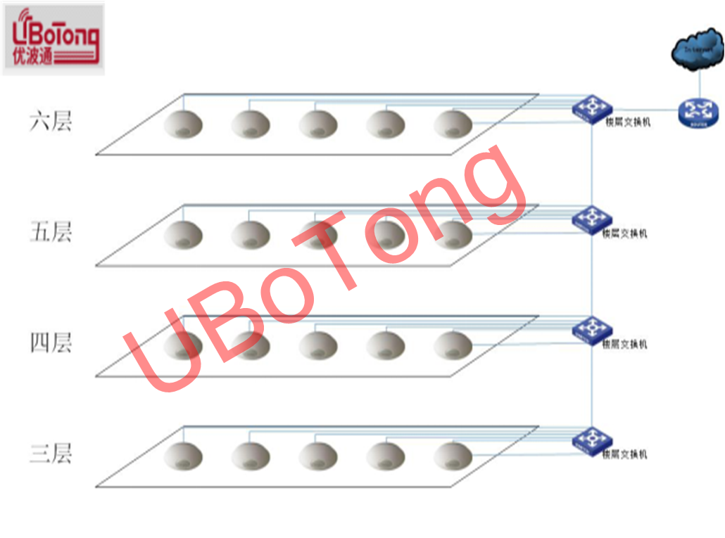 方案中使用UBoTong优波通产品UBT2000-300C和UBT2000-300P吸顶式胖瘦一体AP进行客房覆盖,有很强的穿透能力及高效的稳定性。