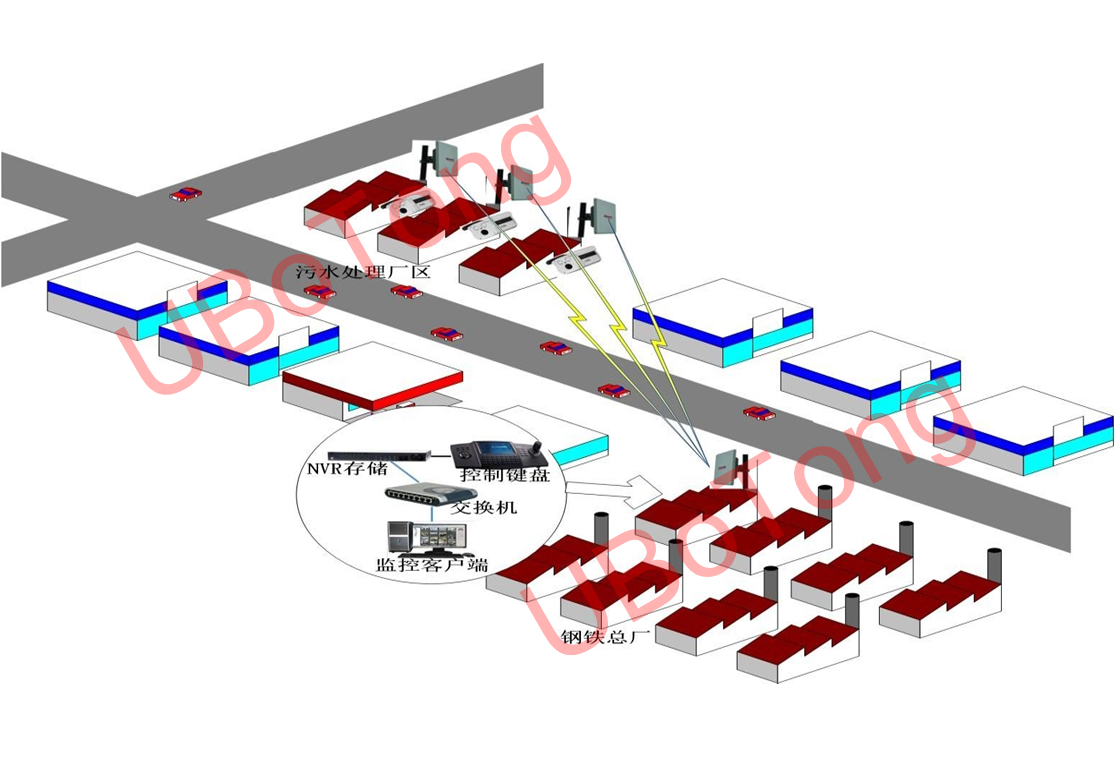 随着钢铁的加工使用,在加工中产生的污水等污染物的处理问题也随之而来,如何保证污水处理场的安全,如何保护企业的财产也值得有关部门关注。为了解决这些问题,重要场所等地点都要监控并能够集中管理,且由于现场坏境复杂,传统的有线系统无法实现污水处理厂的图像回传至总厂监控中心。