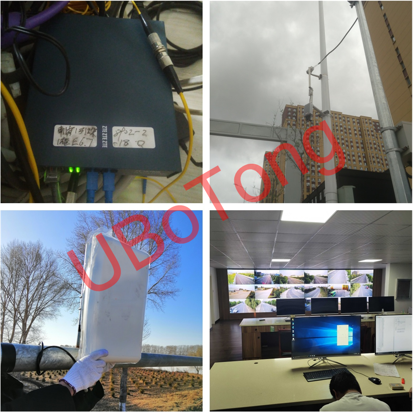 针对本方案中涉及到的考试线路,中间有掉头和转弯存在,这对基站架设位置提出了要求。但为节约警力、加强考试过程中的监管力度和实时数据的采集,决定采用了自动化的考试系统。其中出发地址为驾校监控中心位置,考试车辆9辆,根据考试线路、考试车数量等因素,设计在驾校及考试范围内架设了5.8G 电信级大功率无线基站,基站之间分布着合适的距离,以保证考试车辆在高速行驶中达到良好的无缝漫游传输效果。UBotong室外智能基站覆盖范围大,带宽和接入容量高,快速漫游切换机制,同频组网技术,无缝漫游视频优化处理等,保证考试车辆上的监控视频、语音和各种传感器的数据稳定传输,从而让电子考试系统准确、可靠的运行。再通过光纤将基站接收到的数据传回监控中心,通过硬盘录像机、解码器、分频器等设备输出在电视墙上,并实时把车载机的位置、考试路段、成绩情况等数据显示在电视墙上。