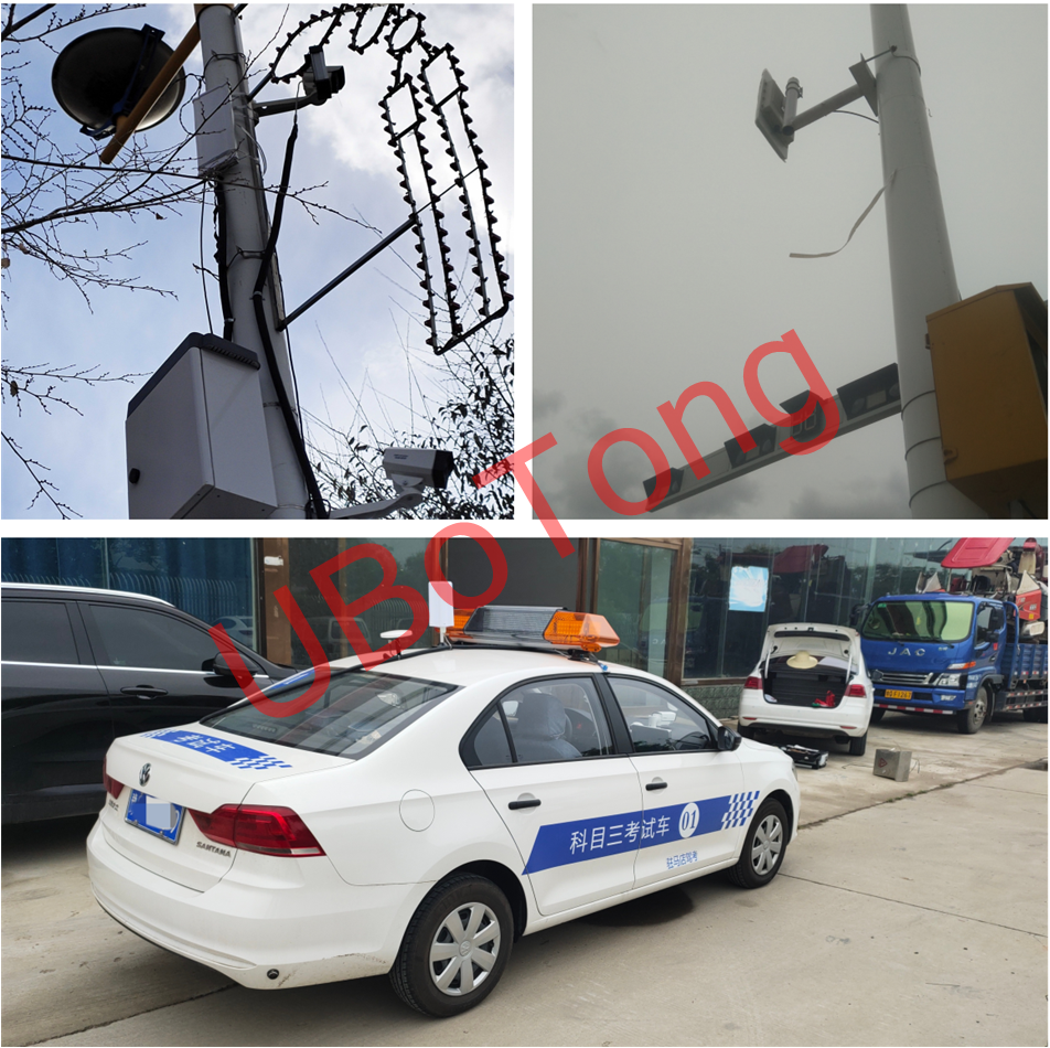 针对本方案中涉及到的考试线路,中间有掉头和转弯存在,这对基站架设位置提出了要求。但为节约警力、加强考试过程中的监管力度和实时数据的采集,决定采用了自动化的考试系统。其中出发地址为驾校监控中心位置,考试车辆9辆,根据考试线路、考试车数量等因素,设计在驾校及考试范围内架设了5.8G 电信级大功率无线基站,基站之间分布着合适的距离,以保证考试车辆在高速行驶中达到良好的无缝漫游传输效果。UBotong室外智能基站覆盖范围大,带宽和接入容量高,快速漫游切换机制,同频组网技术,无缝漫游视频优化处理等,保证考试车辆上的监控视频、语音和各种传感器的数据稳定传输,从而让电子考试系统准确、可靠的运行。再通过光纤将基站接收到的数据传回监控中心,通过硬盘录像机、解码器、分频器等设备输出在电视墙上,并实时把车载机的位置、考试路段、成绩情况等数据显示在电视墙上。
