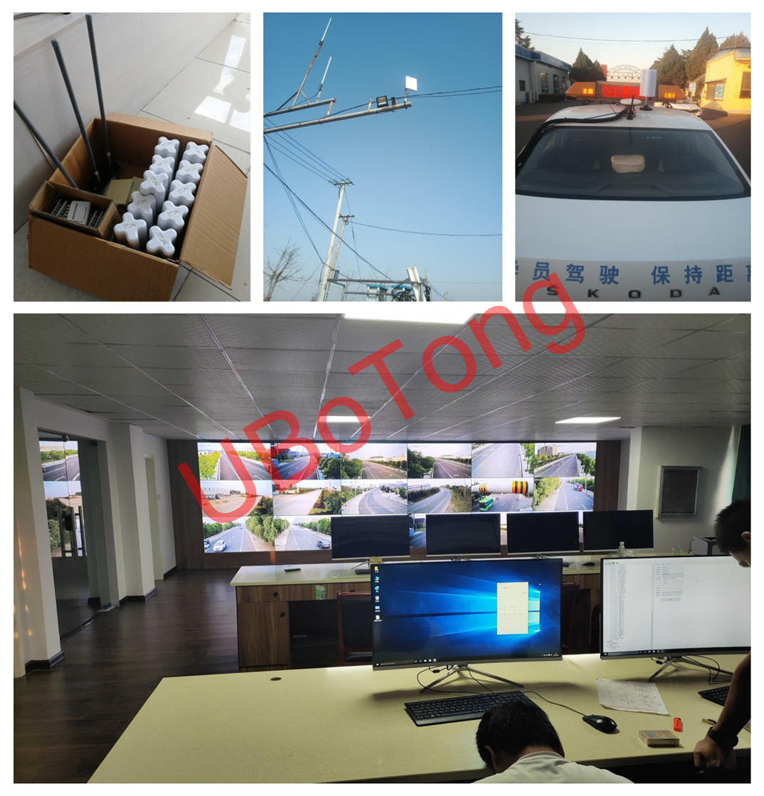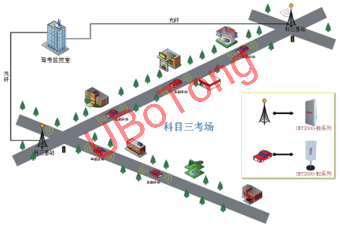 针对本方案中涉及到的考试线路,中间有掉头和转弯存在,这对基站架设位置提出了要求。但为节约警力、加强考试过程中的监管力度和实时数据的采集,决定采用了自动化的考试系统。其中出发地址为驾校监控中心位置,考试车辆9辆,根据考试线路、考试车数量等因素,设计在驾校及考试范围内架设了5.8G 电信级大功率无线基站,基站之间分布着合适的距离,以保证考试车辆在高速行驶中达到良好的无缝漫游传输效果。UBotong室外智能基站覆盖范围大,带宽和接入容量高,快速漫游切换机制,同频组网技术,无缝漫游视频优化处理等,保证考试车辆上的监控视频、语音和各种传感器的数据稳定传输,从而让电子考试系统准确、可靠的运行。再通过光纤将基站接收到的数据传回监控中心,通过硬盘录像机、解码器、分频器等设备输出在电视墙上,并实时把车载机的位置、考试路段、成绩情况等数据显示在电视墙上。