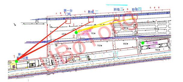 根据现场的提供的信息来看,我们将整个传输网络采用点对多的模式,分2个基站接收回传的模式进行建设。原有基站架设在1号位置,连接第一台门机和新增二门机的无线客户端,在2号位置(基站位置选择1)新增一台基站,连接新增门机三和新增门机四的无线客户端。