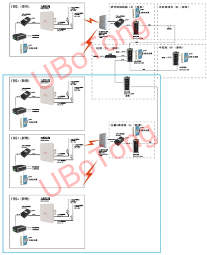 2)然后在4座门机上各安装一台远端发射端设备:UBT2000-CT6300;由于门机移动,所以发射端配合使用高增益无线全向天线使用,用来保障信号不间断。共计4台无线远端发射设备。