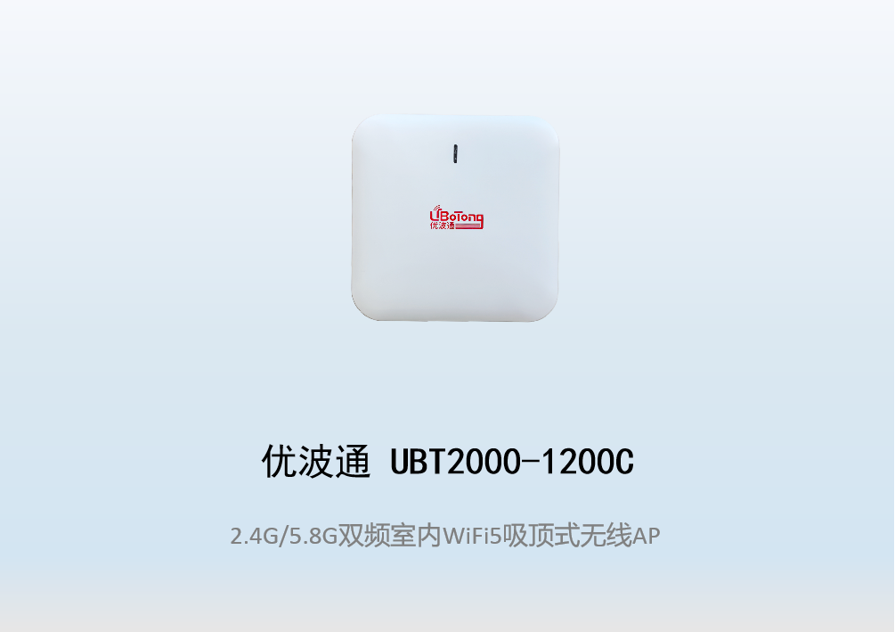 UBotong(优波通)UBT2000-1200C是一款基于802.11a/b/g/n/ac的室内无线吸顶AP,工作在2.4GHz和5.8GHz免许可频段,采用MIMO、OFDM等先进技术,可提供1200Mbps的数据传输速率。整机设计简洁美观、产品性能卓越、部署方便快捷、屏蔽散热性好,性能更稳定,工作在Fit AP模式下,具有传输速率高、稳定性好,接收灵敏度高、覆盖信号强等特点,特别适合酒店宾馆、学校、医院、酒吧、度假村、候机楼、地铁站、大型会议室等高密度场景的无线覆盖应用。