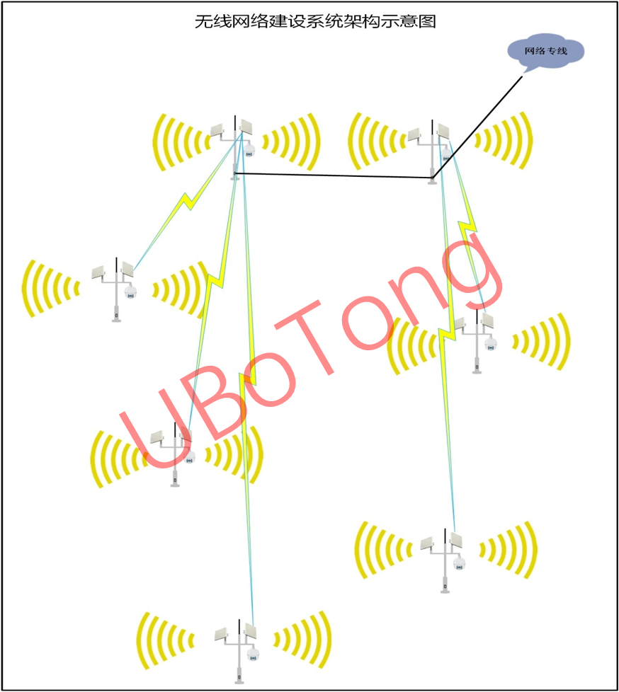 每个点位安装无线覆盖基站配合无线天线对相应区域进行覆盖,点位之间的数据通信通过无线网桥设备进行传输。外网专线落地点选择在1号点位上,在1号点位配备室外机柜,安装专线设备。其他点位通过无线网桥将数据传输到1号点位。
