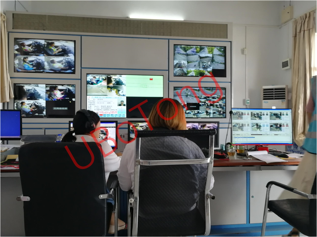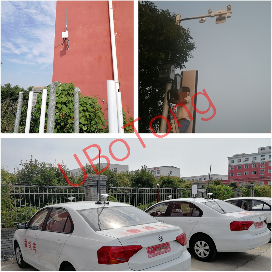针对本方案中涉及到的考试线路,中间有掉头和转弯存在,这对基站架设位置提出了要求。但为节约警力、加强考试过程中的监管力度和实时数据的采集,决定采用了自动化的考试系统。其中出发地址为驾校监控中心位置,考试车辆预预计8辆,根据考试线路、考试车数量等因素,设计在驾校及考试范围内架设了5.8G 电信级大功率无线基站,基站之间分布着合适的距离,以保证考试车辆在高速行驶中达到良好的无缝漫游传输效果。UBotong室外智能基站覆盖范围大,带宽和接入容量高,快速漫游切换机制,同频组网技术,无缝漫游视频优化处理等,保证考试车辆上的监控视频、语音和各种传感器的数据稳定传输,从而让电子考试系统准确、可靠的运行。再通过光纤将基站接收到的数据传回监控中心,通过硬盘录像机、解码器、分频器等设备输出在电视墙上,并实时把车载机的位置、考试路段、成绩情况等数据显示在电视墙上。