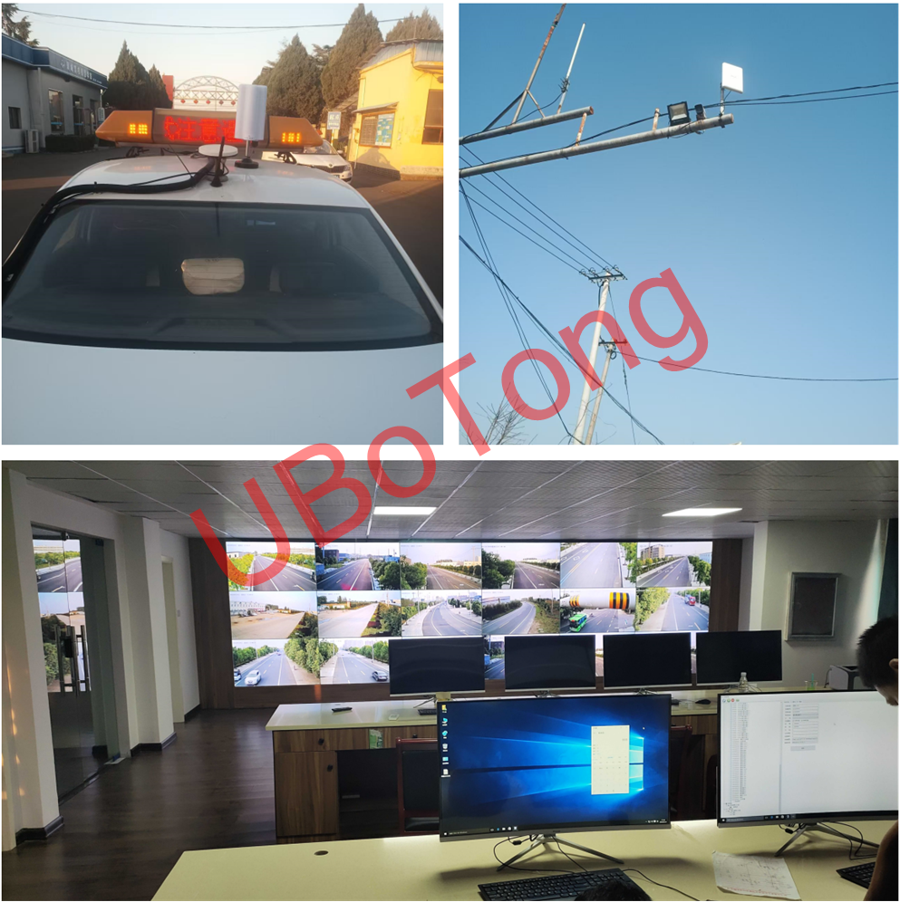 针对本方案中涉及到的考试线路,中间有掉头和转弯存在,这对基站架设位置提出了要求。但为节约警力、加强考试过程中的监管力度和实时数据的采集,决定采用了自动化的考试系统。其中出发地址为驾校监控中心位置,考试车辆9辆,根据考试线路、考试车数量等因素,设计在驾校及考试范围内架设了5.8G 电信级大功率无线基站,基站之间分布着合适的距离,以保证考试车辆在高速行驶中达到良好的无缝漫游传输效果。UBotong室外智能基站覆盖范围大,带宽和接入容量高,快速漫游切换机制,同频组网技术,无缝漫游视频优化处理等,保证考试车辆上的监控视频、语音和各种传感器的数据稳定传输,从而让电子考试系统准确、可靠的运行。再通过光纤将基站接收到的数据传回监控中心,通过硬盘录像机、解码器、分频器等设备输出在电视墙上,并实时把车载机的位置、考试路段、成绩情况等数据显示在电视墙上。